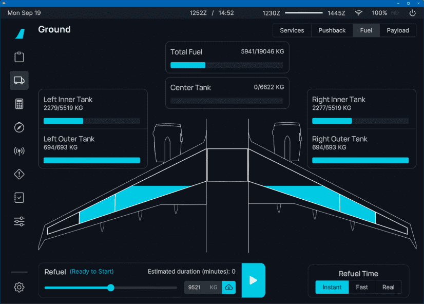 The fuel page provides accurate information about the quantity of fuel in the different tanks of the aircraft. It also allows fueling or defueling the aircraft to the desired fuel quantity.