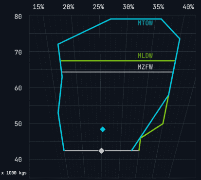 This shows the CG and ZFWCG envelope of the aircraft. The current CG is sown in cyan and the ZFWCG is shown in white.