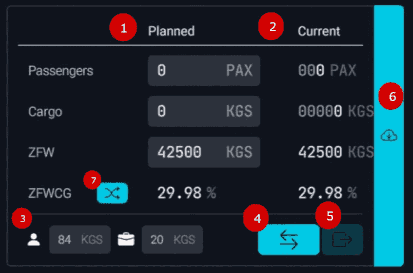 • Shows the current number of passengers, weight of cargo and ZFW.