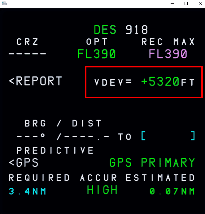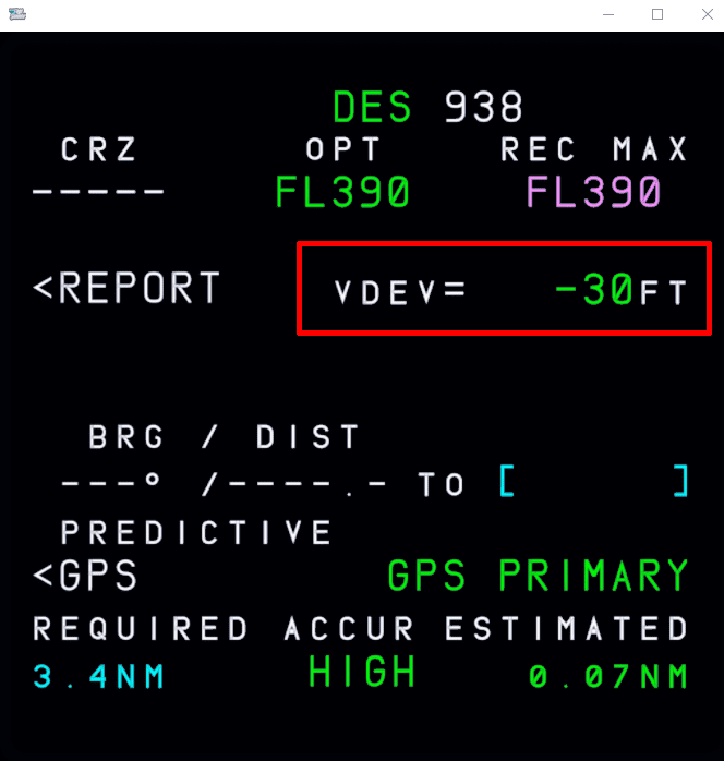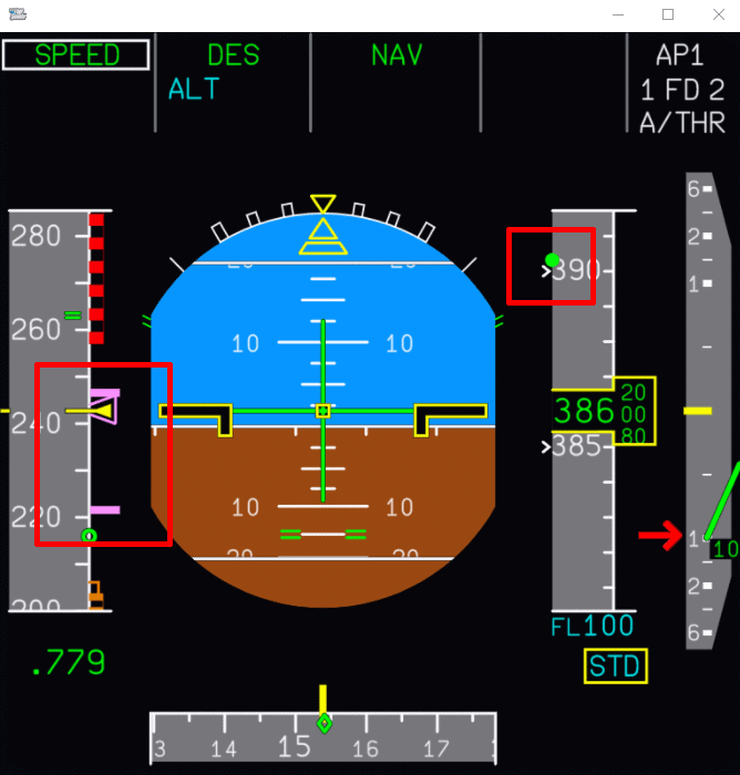 - The V/DEV or "yoyo" indicator. It provides a visual indicator of how far below the descent profile from the command altitude (FL100). In this case, you will notice the aircraft is far below the profile, in part due to starting the descent early.