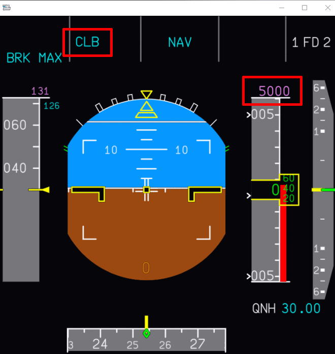 - The cyan arrow indicates that CLB is armed, and the AP will continue climbing above 5000 ft at