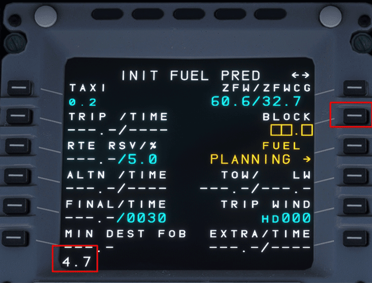 To navigate to the INIT FUEL PRED page, we first have to select the INIT button. Once on INIT A, use the horizontal slew keys to switch the page to INIT FUEL PRED.