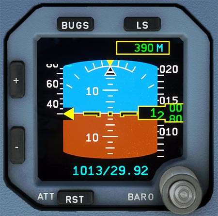 - It allows the bug value to be set by rotating the BARO knob. This value cannot be lower than 30 kt for a speed bug, or a negative value for an altitude bug.