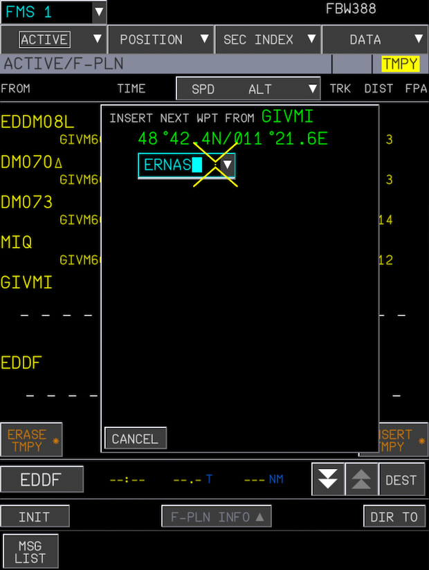 FLT NBRfield so a blue typing cursor appears in the field. - Using your keyboard, type the flight number you want to use (e.g. "FBW388") and press the