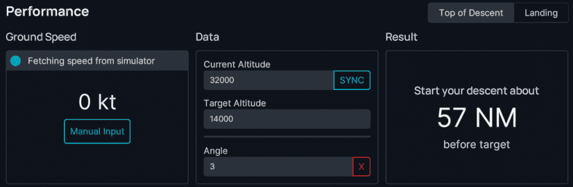 4. Calculate the required distance needed to descend to that waypoint with a standard descent angle of 3°. We can use the FlyByWire flyPad in the cockpit or a simple rule of thumb calculation (details below).