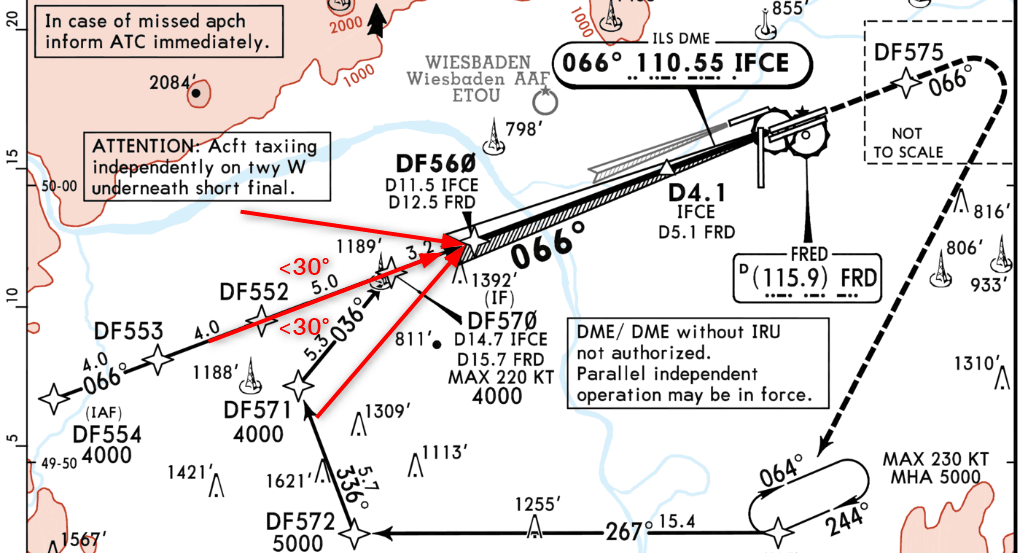 Note: If you do fly without Online ATC use DIR TO to the IAF waypoint DF554 after DF644 to start the final approach and intercept the ILS localizer.