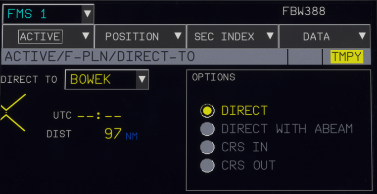 To use the DIR TO function, go to the F-PLN page and select the waypoint you want to know the distance to. Then press on the waypoint and select the DIR TO option in the popup menu.